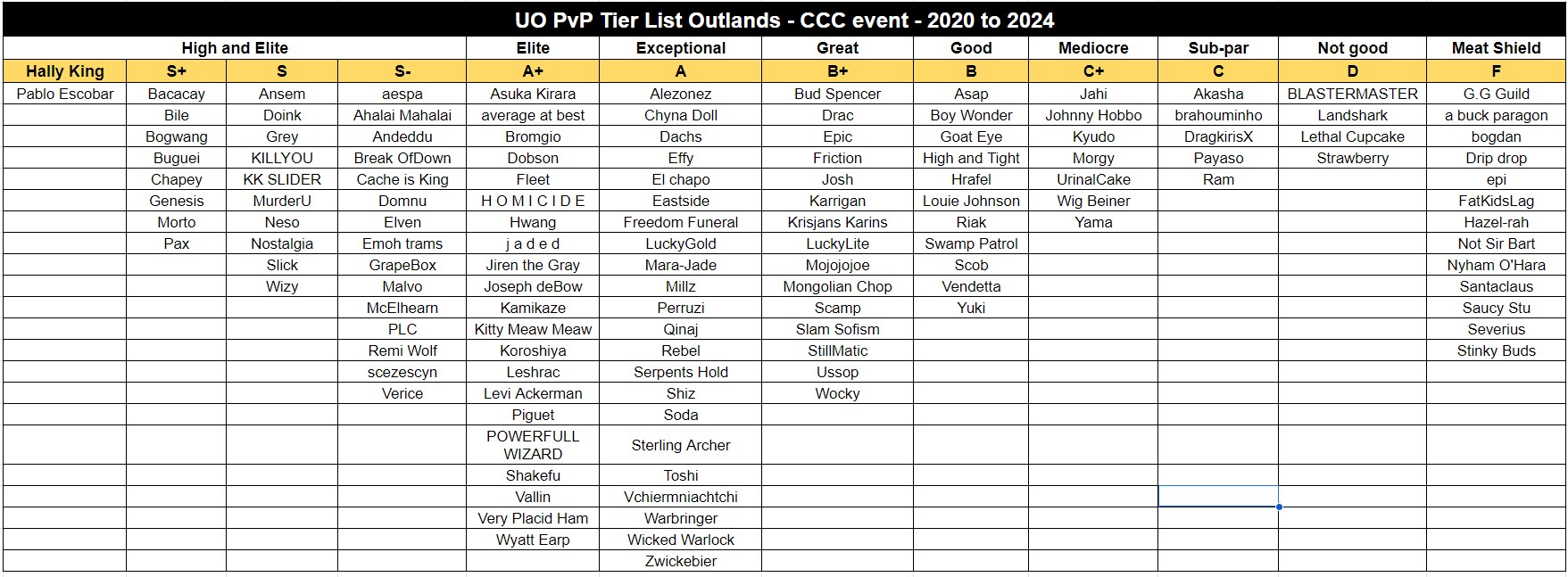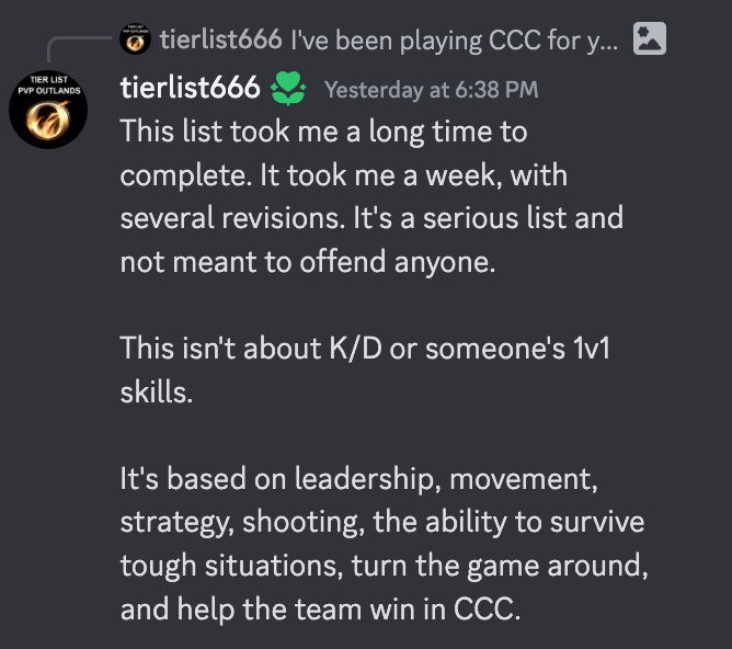 On September 4th, 2024, a random discord user using the handle tierlist666 posted what they believe to be an objective tier list from over four years of playing Corpse Creek Contest: